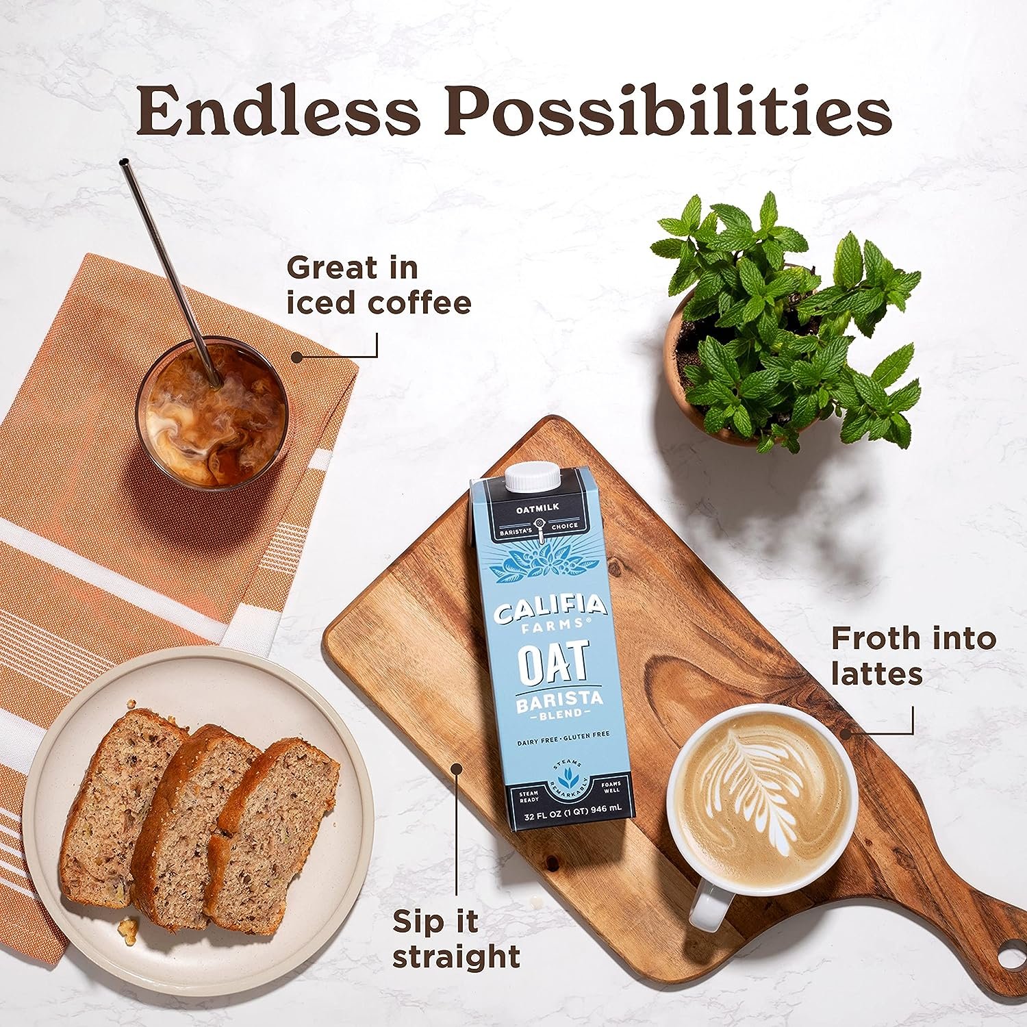 - BARISTA’S CHOICE DAIRY-FREE MILK: Califia Farms Barista Blends are favored by professional baristas across the country for their ability to froth, steam, and form latte art.